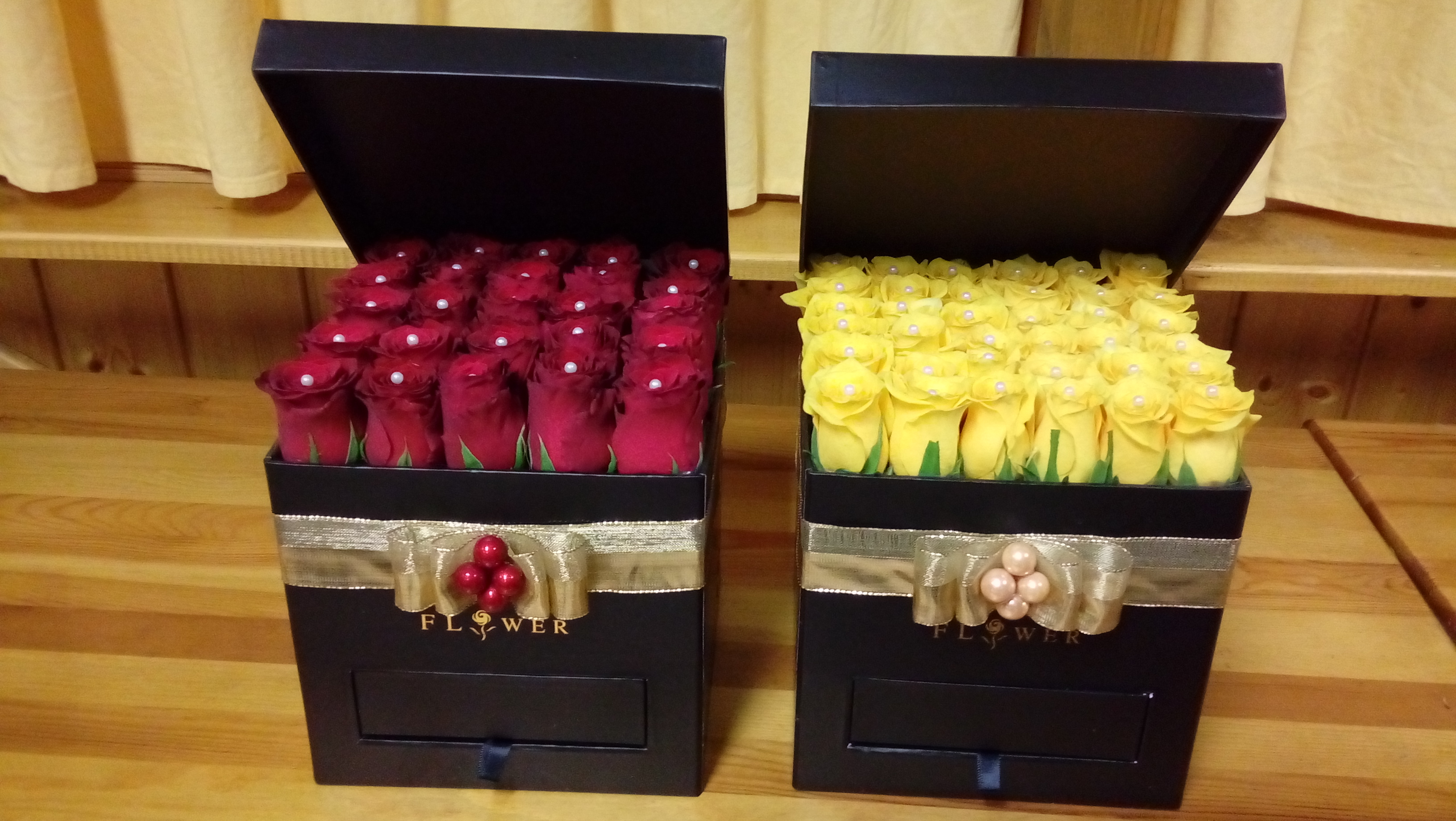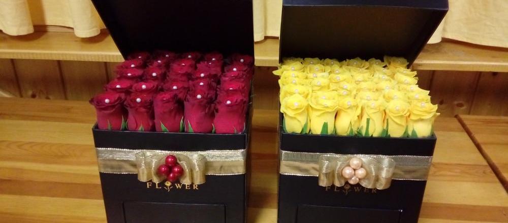 Dobozba zárt élő virág (oázisban) : 1 szálas rózsás 1250 Ft, 3 szálas 1850 Ft