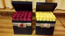 Dobozba zárt élő virág (oázisban) : 1 szálas rózsás 1250 Ft, 3 szálas 1850 Ft